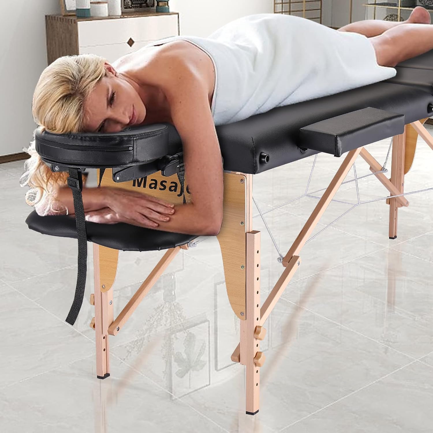 Der Portable Massage Table 3 Folding Massage Table von Masajeo ist nicht einfach nur ein Behandlungstisch – er ist ein maßgeschneidertes Arbeitsinstrument für anspruchsvolle Kosmetiker:innen, Masseur:innen, Reiki-Praktiker:innen und alle, die höchste Ansprüche an Komfort, Funktionalität und Langlebigkeit stellen. Egal, ob Sie in Ihrem eigenen Studio arbeiten, bei Kund:innen zu Hause behandeln oder mobile Dienstleistungen anbieten – dieser Tisch begleitet Sie zuverlässig und professionell durch jeden Arbeitstag. Mit seiner eleganten schwarzen Optik, dem stabilen Holzrahmen und den durchdachten Details überzeugt er auf ganzer Linie.